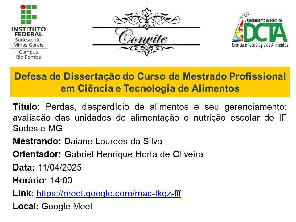 Temos a satisfação de convidá-los(as) para a defesa de mestrado intitulada: "Perdas, desperdício de alimentos e seu gerenciamento: avaliação das unidades de alimentação e...