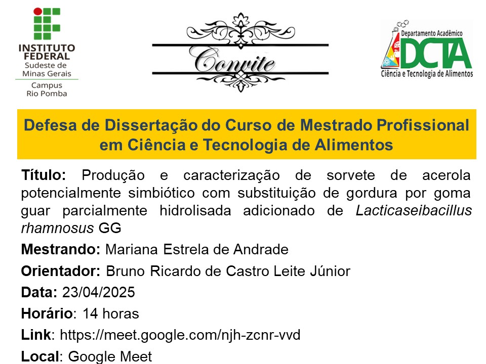 Temos a satisfação de convidá-los(as) para a defesa de mestrado intitulada: "Produção e caracterização de sorvete de acerola potencialmente simbiótico com substituição de...