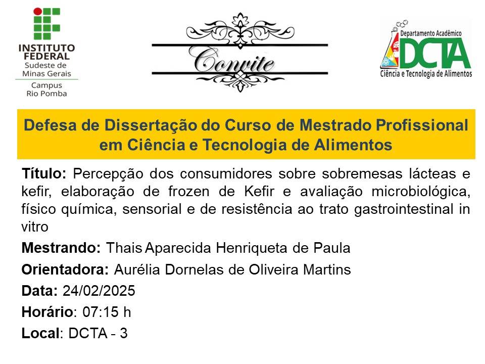 Temos a satisfação de convidá-los(as) para a defesa de mestrado, intitulada: "Percepção dos consumidores sobre sobremesas lácteas e kefir, elaboração de frozen de Kefir e...