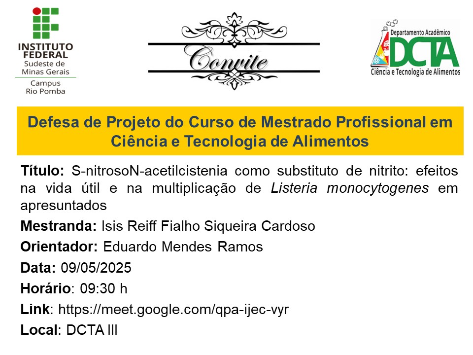 Temos a satisfação de convidá-los(as) para a defesa de projeto, intitulada: "S-nitrosoN-acetilcistenia como substituto de nitrito: efeitos na vida útil e na multiplicação de...