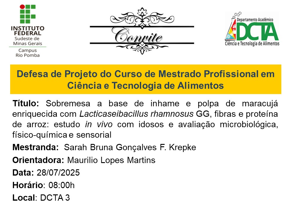 Temos a satisfação de convidá-los(as) para a defesa de projeto, intitulada: "Sobremesa a base de inhame e polpa de maracujá enriquecida com Lacticaseibacillus rhamnosus GG, fibras e...