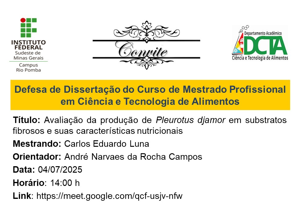 Temos a satisfação de convidá-los(as) para a defesa, intitulada: "Avaliação da produção de Pleurotus djamor em substratos fibrosos e suas características nutricionais", do...