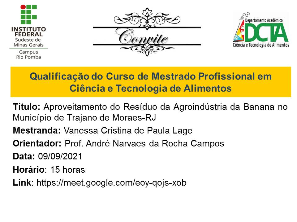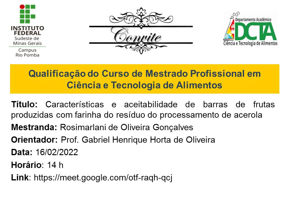 Temos a satisfação de convidá-los(as) para a qualificação, intitulada: "Características e aceitabilidade de barras de frutas produzidas com farinha do resíduo do processamento de...