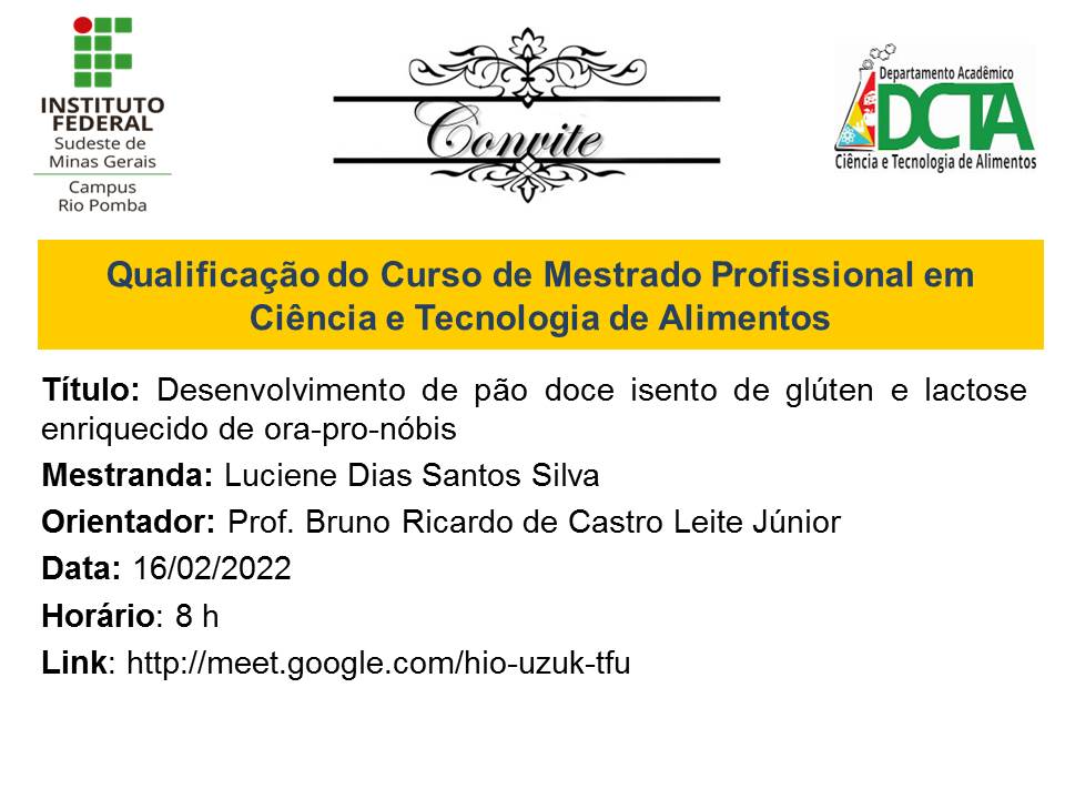 Temos a satisfação de convidá-los(as) para a qualificação, intitulada: "Desenvolvimento de pão doce isento de glúten e lactose enriquecido de ora-pro-nóbis", da...