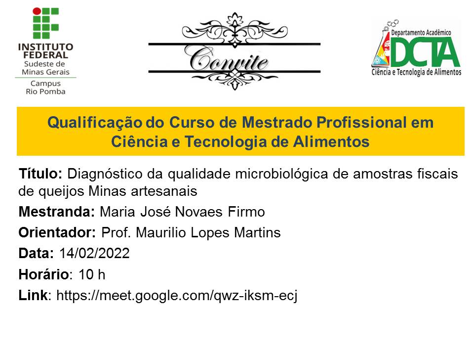 Temos a satisfação de convidá-los(as) para a qualificação, intitulada: "Diagnóstico da qualidade microbiológica de amostras fiscais de queijos Minas artesanais", da...