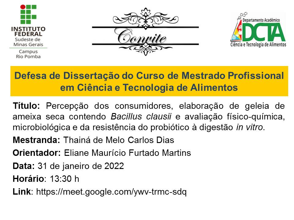 Temos a satisfação de convidá-los(as) para a defesa de mestrado, intitulada: "Percepção dos consumidores, elaboração de geleia de ameixa seca contendo Bacillus clausii e...