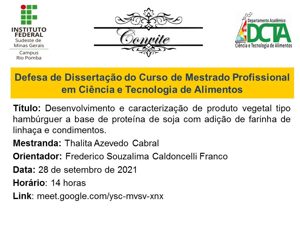 Temos a satisfação de convidá-los(as) para a defesa de mestrado, intitulada: "Desenvolvimento e caracterização de produto vegetal tipo hambúrguer a base de proteína de soja com...