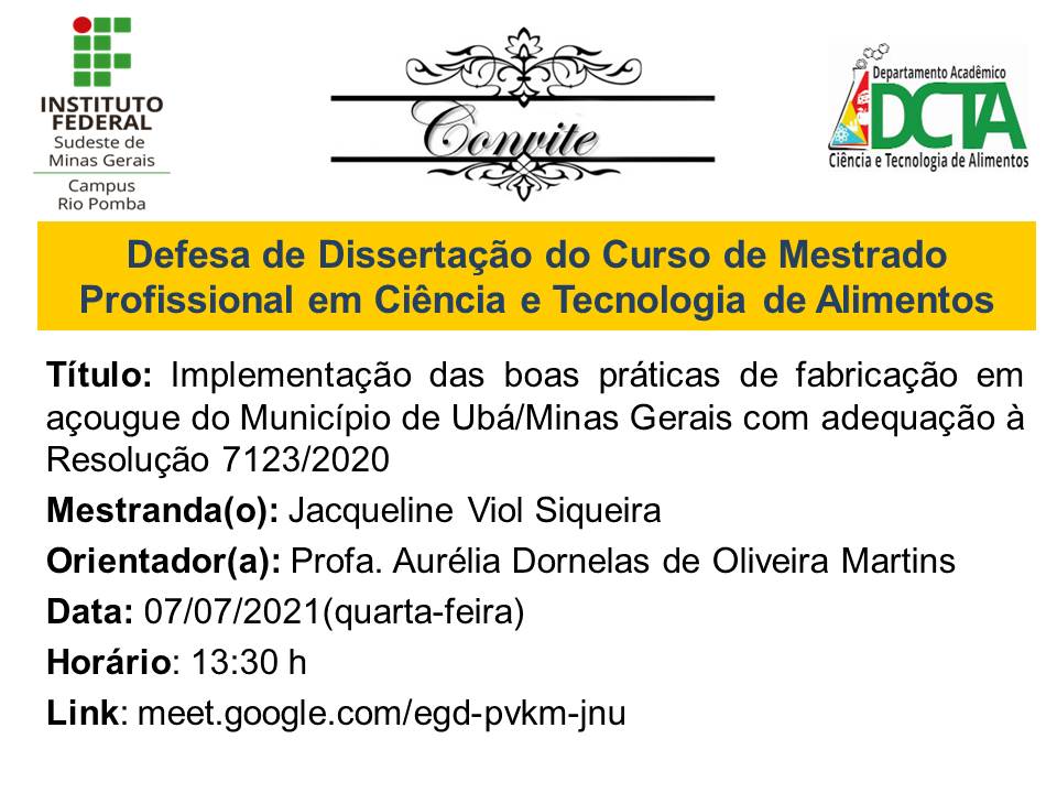 Temos a satisfação de convidá-los(as) para a defesa de mestrado, intitulada: "Implementação das boas práticas de fabricação em açougue do Município de Ubá/Minas Gerais com...