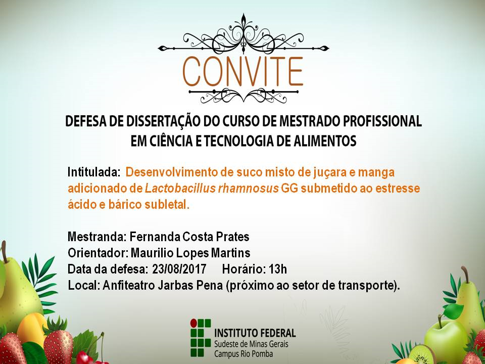 Prezados, Temos a satisfação de convidá-los para a defesa de dissertação, intitulada: "Desenvolvimento de suco misto de juçara e manga adicionado deLactobacillus...