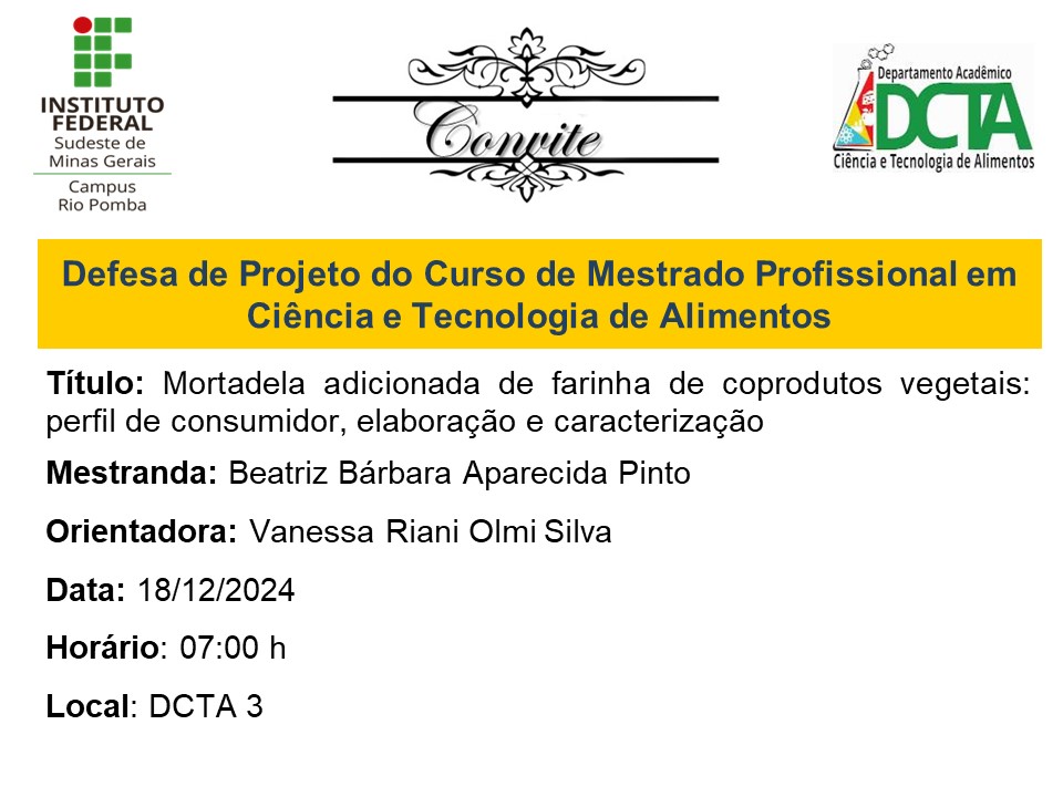 Temos a satisfação de convidá-los(as) para a defesa de projeto de mestrado, intitulada: "Mortadela adicionada de farinha de coprodutos vegetais: perfil de consumidor, elaboração e...