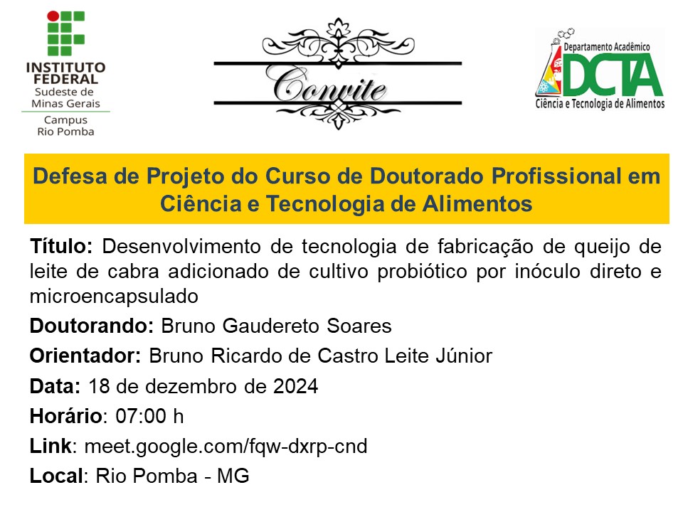 Temos a satisfação de convidá-los(as) para a defesa de projeto intitulada: "Desenvolvimento de tecnologia de fabricação de queijo de leite de cabra adicionado de cultivo probiótico...