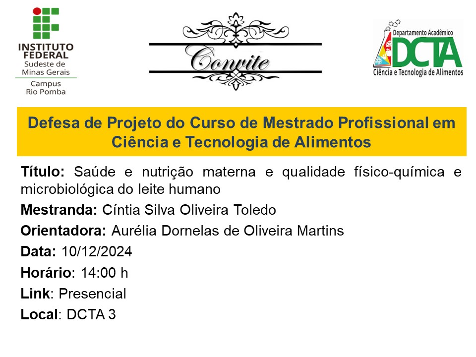 Temos a satisfação de convidá-los(as) para a defesa de projeto, intitulada: "Saúde e nutrição materna e qualidade físico-química e microbiológica do leite humano", da...