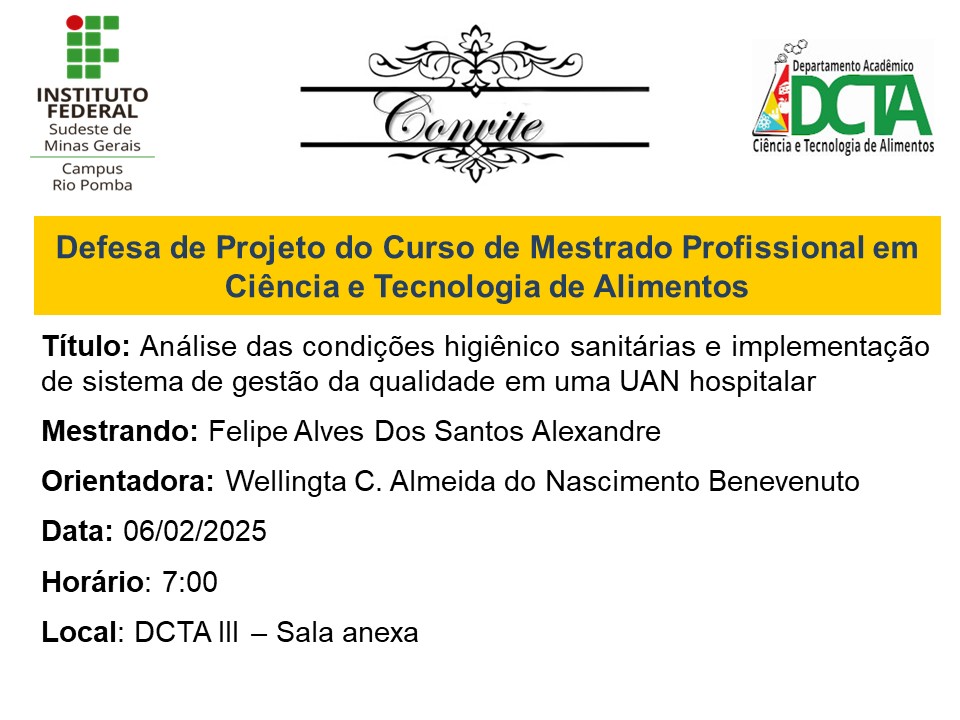 Temos a satisfação de convidá-los(as) para a defesa de projeto, intitulada: "Análise das condições higiênico sanitárias e implementação de sistema de gestão da qualidade em uma...