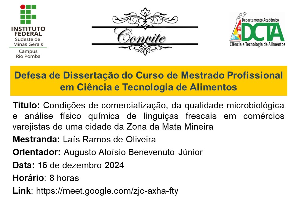 Temos a satisfação de convidá-los(as) para a defesa de mestrado, intitulada: "Condições de comercialização, da qualidade microbiológica e análise físico química de...