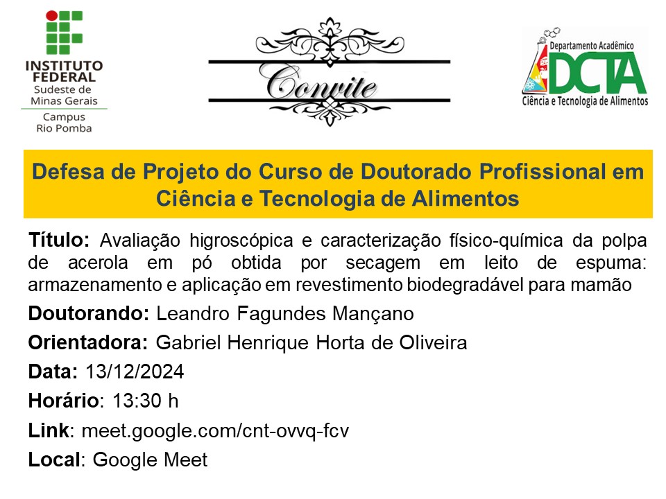 Temos a satisfação de convidá-los(as) para a defesa de projeto intitulada: "Avaliação higroscópica e caracterização físico-química da polpa de acerola em pó obtida por secagem...