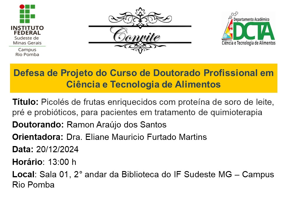 Temos a satisfação de convidá-los(as) para a defesa de projeto, intitulada: "Picolés de frutas enriquecidos com proteína de soro de leite, pré e probióticos, para pacientes em...