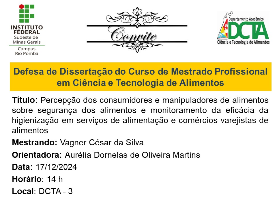 Temos a satisfação de convidá-los(as) para a defesa de mestrado, intitulada: "Percepção dos consumidores e manipuladores de alimentos sobre segurança dos alimentos e monitoramento...