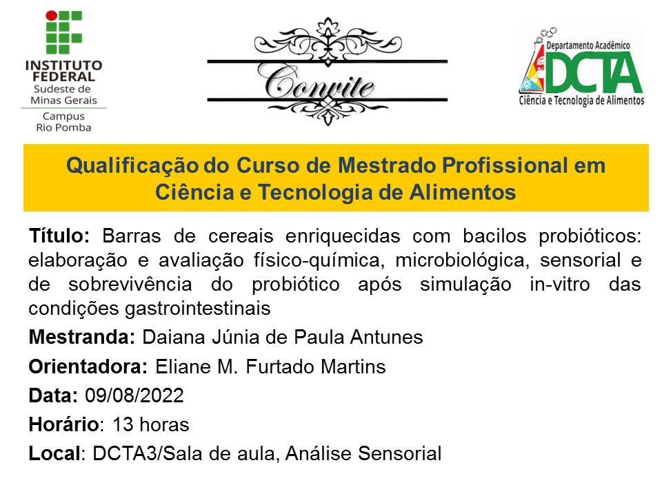Temos a satisfação de convidá-los(as) para a qualificação, intitulada: "Barras de cereais enriquecidas com bacilos probióticos: elaboração e avaliação físico-química,...