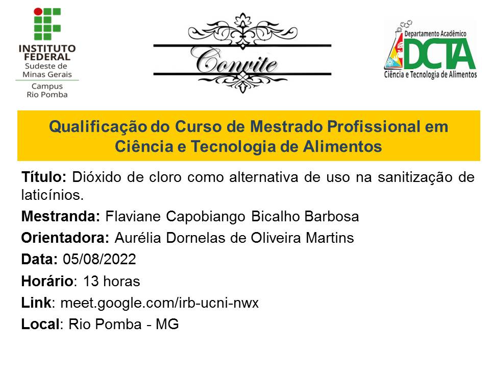 Temos a satisfação de convidá-los(as) para a qualificação, intitulada: "Dióxido de cloro como alternativa de uso na sanitização de laticínios", da mestranda Flaviane Capobiango...