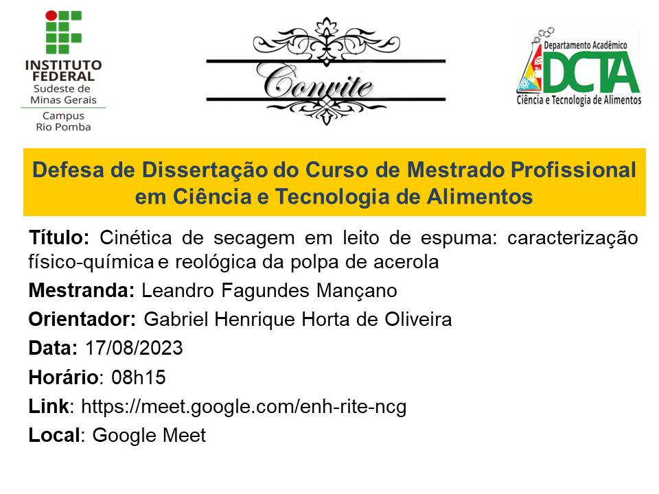Temos a satisfação de convidá-los(as) para a qualificação, intitulada: "Cinética de secagem em leito de espuma: caracterização físico-química e reológica da polpa de acerola",...