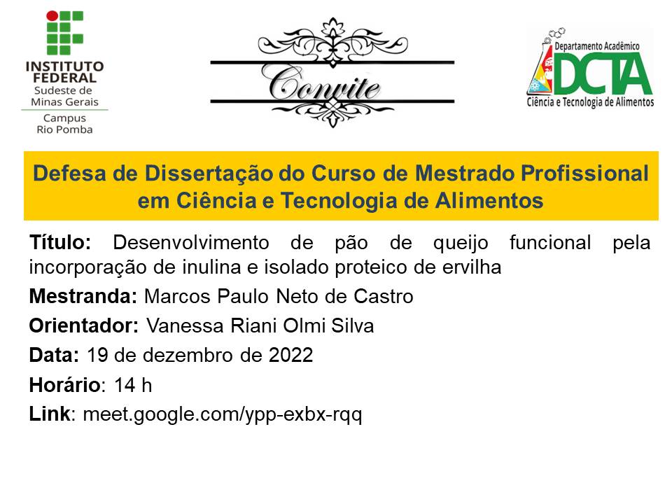 Temos a satisfação de convidá-los(as) para a defesa de mestrado, intitulada: "Desenvolvimento de pão de queijo funcional pela incorporação de inulina e isolado proteico de ervilha",...