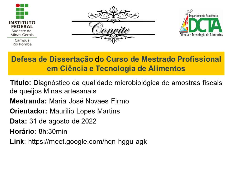 Temos a satisfação de convidá-los(as) para a defesa de mestrado, intitulada: "Diagnóstico da qualidade microbiológica de amostras fiscais de queijos Minas artesanais", da...