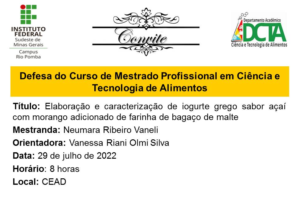 Temos a satisfação de convidá-los(as) para a defesa de mestrado, intitulada: "Elaboração e caracterização de iogurte grego sabor açaí com morango adicionado de farinha de bagaço...