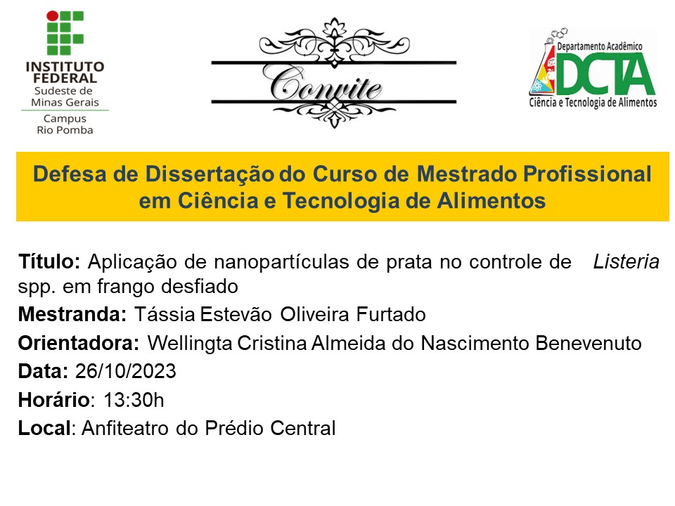 Temos a satisfação de convidá-los(as) para a qualificação, intitulada: "Aplicação de nano partículas de prata como agente antimicrobiano em frango desfiado", da mestranda Tássia...