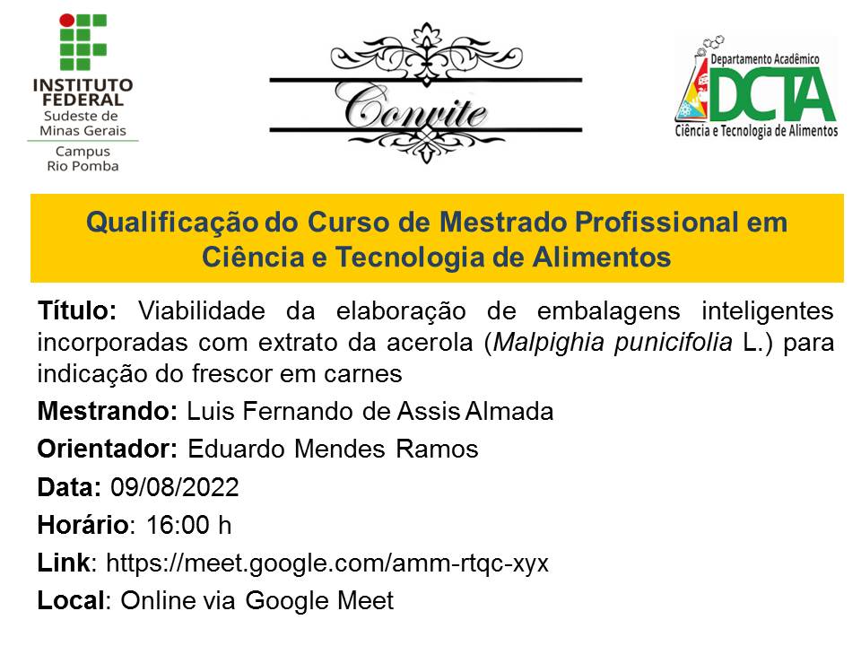 Temos a satisfação de convidá-los(as) para a qualificação, intitulada: "Viabilidade da elaboração de embalagens inteligentes incorporadas com extrato da acerola (Malpighia...