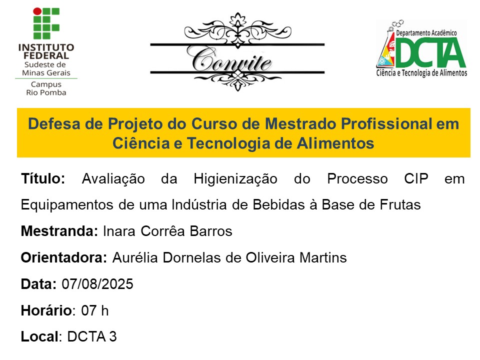 Temos a satisfação de convidá-los(as) para a defesa de projeto, intitulada: "Avaliação da Higienização do Processo CIP em Equipamentos de uma Indústria de Bebidas à Base de...