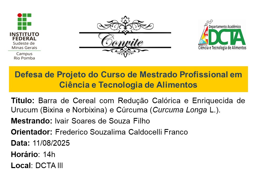 Temos a satisfação de convidá-los(as) para a defesa de projeto de mestrado, intitulada: "Barra de Cereal com Redução Calórica e Enriquecida de Urucum (Bixina e Norbixina) e Cúrcuma...