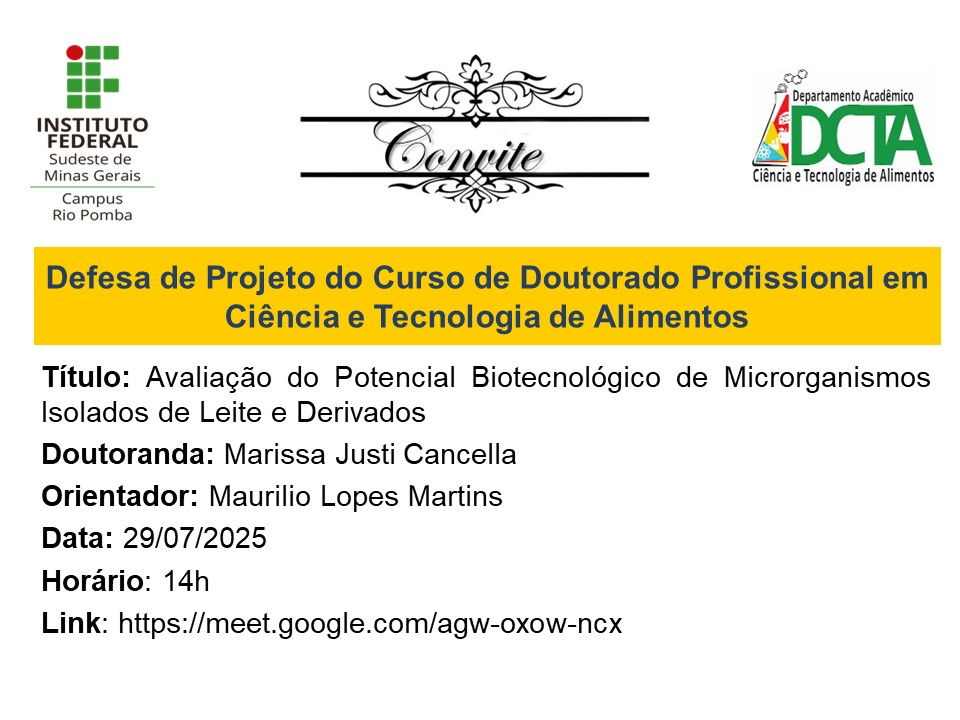 Temos a satisfação de convidá-los(as) para a defesa de projeto, intitulada: "Avaliação do Potencial Biotecnológico de Microrganismos Isolados de Leite e Derivados", da...