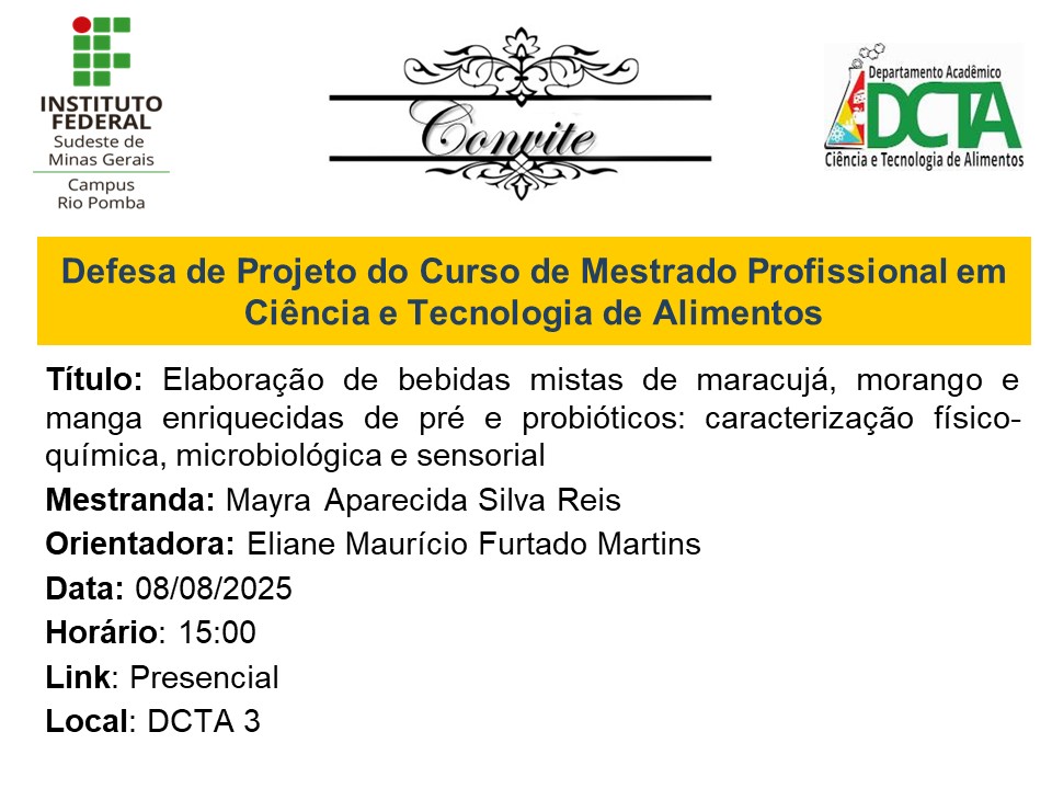 Temos a satisfação de convidá-los(as) para a defesa de projeto, intitulada: "Elaboração de bebidas mistas de maracujá, morango e manga enriquecidas de pré e probióticos:...