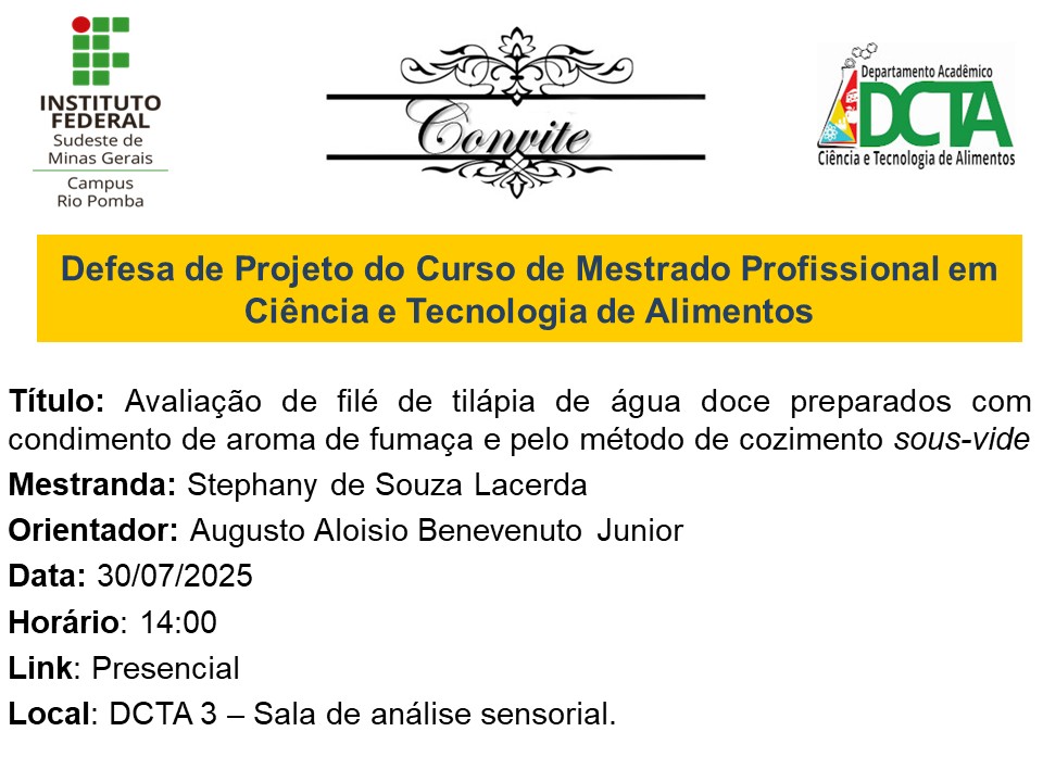 Temos a satisfação de convidá-los(as) para a defesa de projeto, intitulada: "Avaliação de filé de tilápia de água doce preparados com condimento de aroma de fumaça e pelo método...