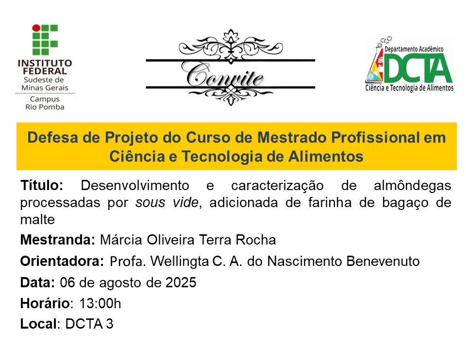 Temos a satisfação de convidá-los(as) para a defesa de projeto, intitulada: "Desenvolvimento e caracterização de almôndegas processadas por sous vide, adicionada de farinha de...